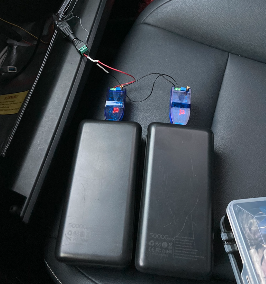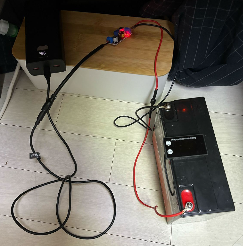 그리고 이 충전된 저렴한 배터리를 Y형 케이블로 연결한 후, 이로부터 나오는 전기를 패스스루 배터리로 다시 충전하였습니다. 그리고 DC-DC 컨버터를 통해 5V의 전기를 12V로 변환하는 구조를 만들었습니다.