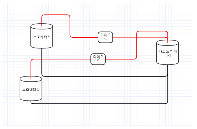 다이오드는 큰 전류(CC or A)에서 잘 작동하는 장치인데, 보조 배터리에서 나오는 작은 전류로는 전압이 떨어지는 등 여러 문제가 발생하였습니다.