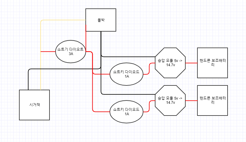 전에 배선 구조로 잘 쓰고 있는데 언제나 운행 중 배터리를 쓰는게 맘에 들지 않았다 그러다가 전에 다이오드를 정류 다이오드를 구매하여 잘 되지 않았다는 걸 알았다 그래서 이번에 쇼트키 다